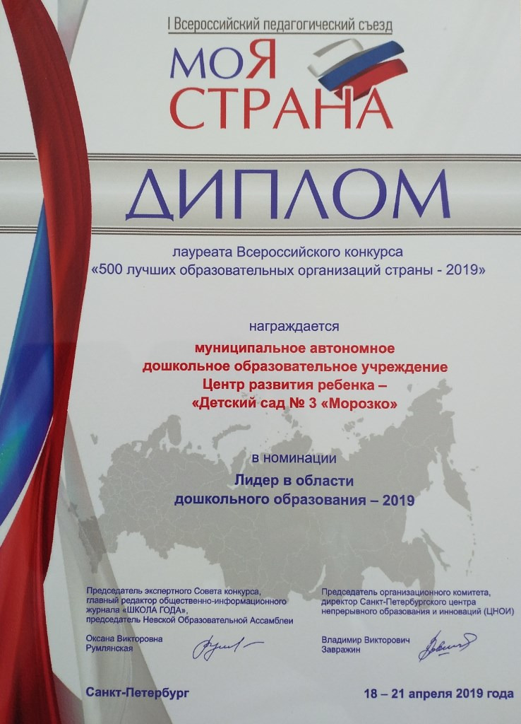 В апреле 2019 года в городе Санкт-Петербурге состоялся I Всероссийский педагогический съезд «Моя страна», в рамках которого проходила торжественная церемония награждения лауреатов Всероссийского конкурса «500 лучших образовательных организаций страны – 2019».