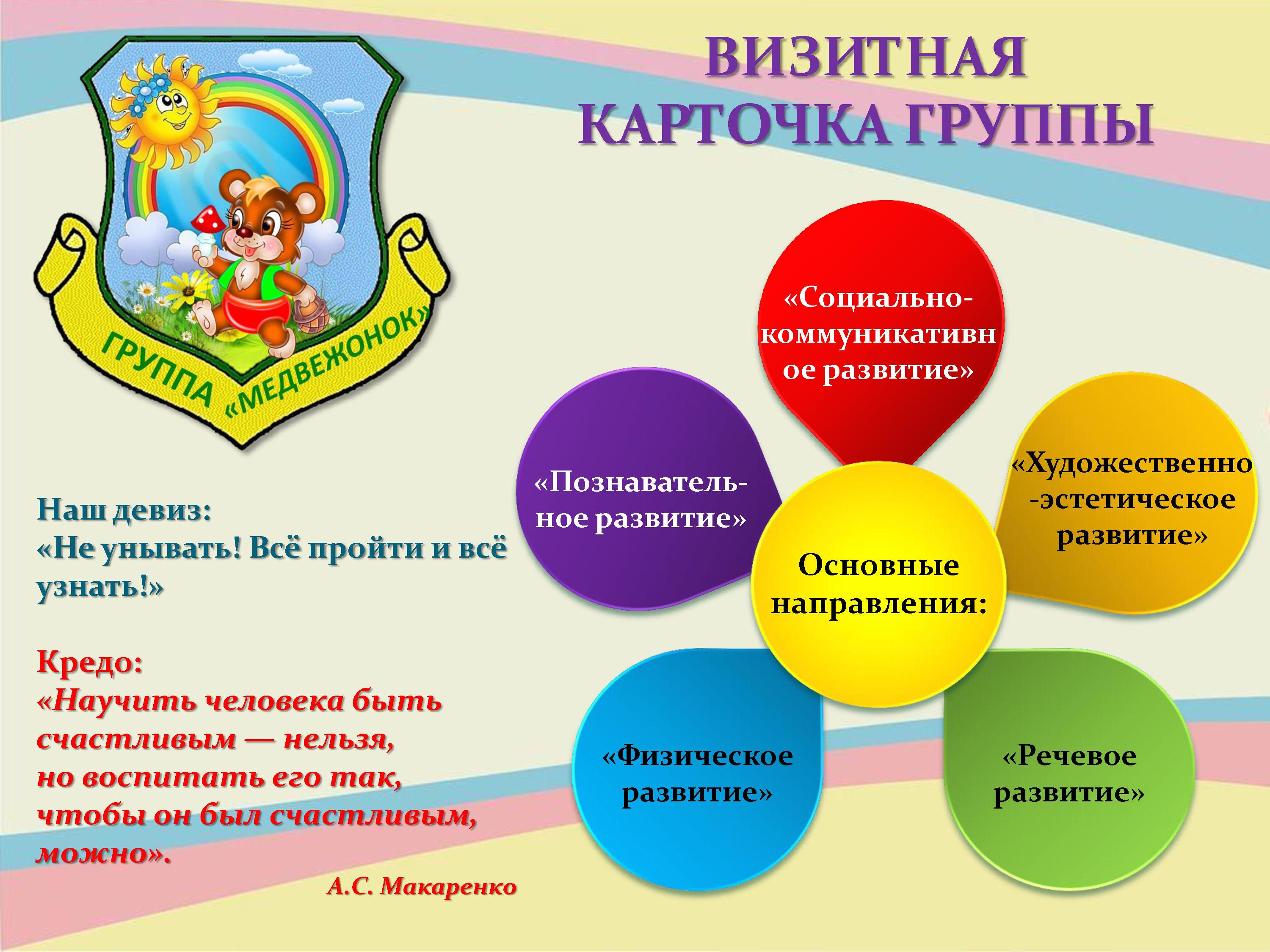 Знаем мы еще с пеленок: Наша группа – «Медвежонок»! Мы играем и поем, Мир и дружбу познаем. С воспитателем гуляем, Развиваемся, читаем. В садик с радостью идем, С каждым днем растем, растем. Много праздников встречаем И, поверьте, точно знаем – Скажет вам из нас любой: «Медвежонок» - дом второй! |