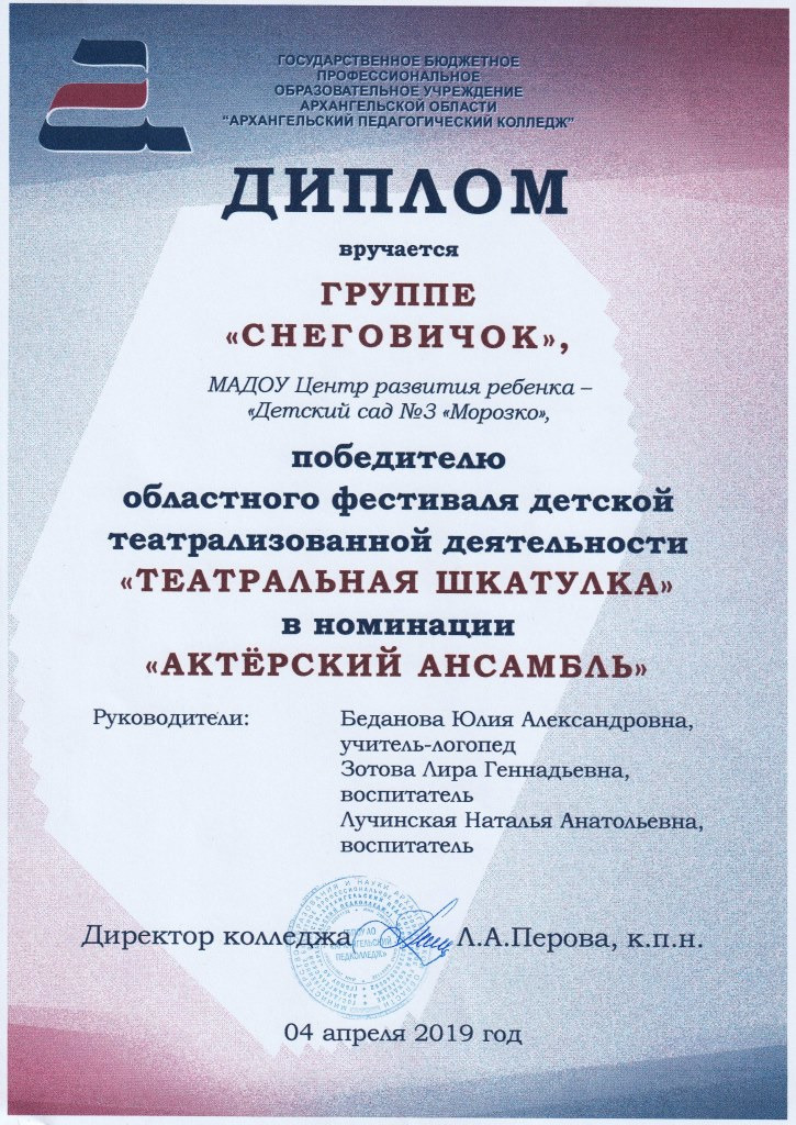 Ребята из группы «Снеговичок» со своими руководителями: учителем-логопедом Бедановой Ю.А. и воспитателями Зотовой Л.Г. и Лучинской Н.А. продолжают радовать всех своими успехами в театральном мастерстве. Свой спектакль по сказке В. Сутеева они представили на заочном областном конкурсе-фестивале детской театрализованной деятельности «Театральная шкатулка», организованным Архангельским педагогическим колледжем.