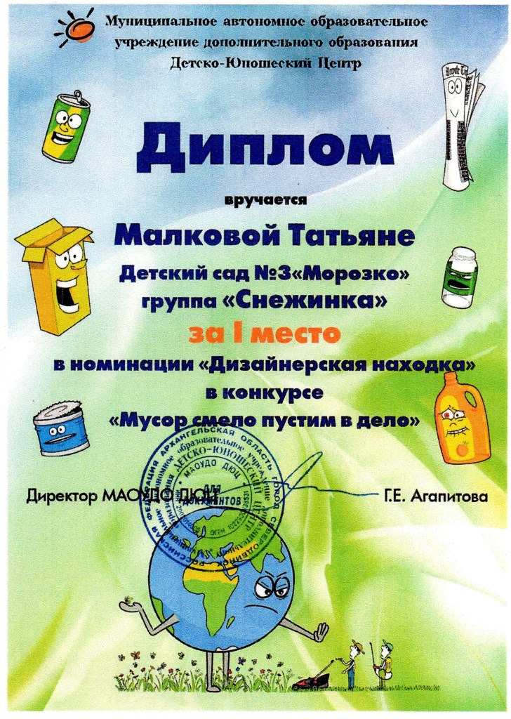 Проблема мусора стала сегодня одной из самых важных экологических проблем. Наши воспитанники знают, что из того, что люди выбрасывают в мусорное ведро, можно сделать много интересных и оригинальных вещей. Семьи наших воспитанников приняли участие в выставке творческих работ «Мусор смело пустим в дело». К работе участники выставки отнеслись серьезно и вложили много фантазии, терпения, труда. Копилка, музыкальные инструменты, цветы, сказочные герои появились из обычного вторичного сырья. Работа Малковой Тани «Железный дровосек» победила в номинации «Дизайнерская находка».