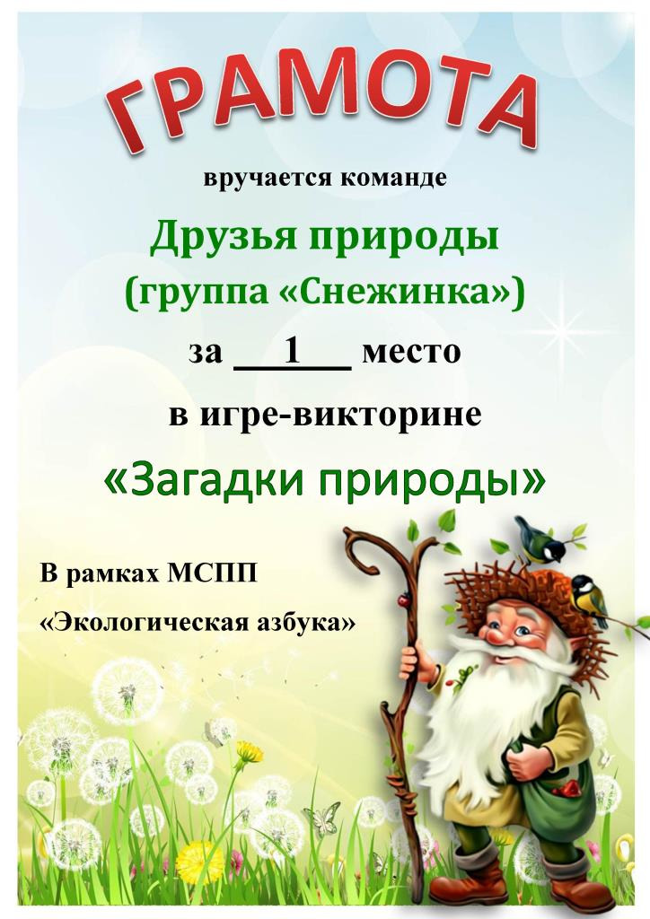 Воспитание чувства любви к природе невозможно без знаний об особенностях объектов природы: животных, растений, воздуха, воды, почвы, поэтому игровые испытания для ребят в программе начались с игры-викторины «Загадки природы», которая познакомила их с проблемами экологии. Воспитанники получили знания об экосистемах, закрепили правила поведения в природе. В этой игре наша команда «Друзья природы» получила 1 место.