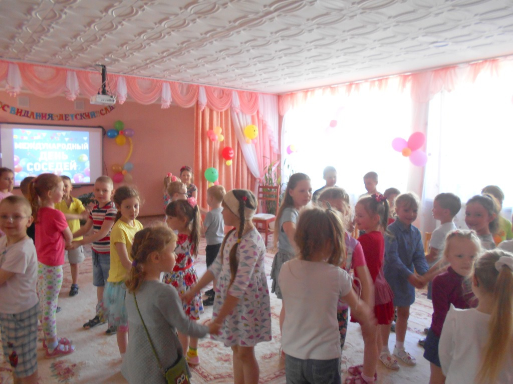 Дети старшей и подготовительной к школе групп собрались в музыкальном зале на веселую, развлекательную игровую программу «Все соседи в гости к нам». Музыкальный руководитель Волкова Нина Павловна рассказала дошкольникам об истории этого праздника. Затем с детьми были проведены веселые игры-аттракционы, конкурсы, соревнования. Дети из соседних групп подружились, лучше узнали друг друга. Они пели песни про детский сад, танцевали, отгадывали загадки, зарядились хорошим настроением.
