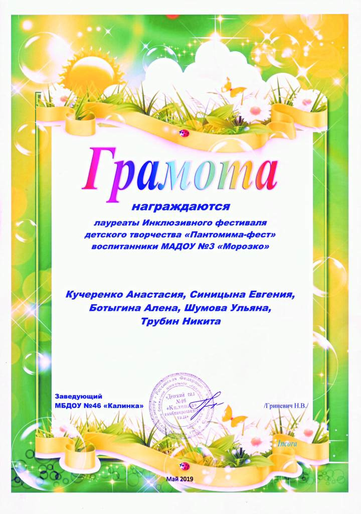 23 мая 2019 года на базе МБОУ № 46 «Калинка» состоялся фестиваль детского творчества «Пантомима-фест», в котором приняли участие 12 команд из детских садов города. Наш детский сад представляли воспитанники групп «Снегирёк» и «Солнышко» под руководством учителя-логопеда Кучеренко А.В., воспитателей Синицыной А.О. и Охоловой А.Н.