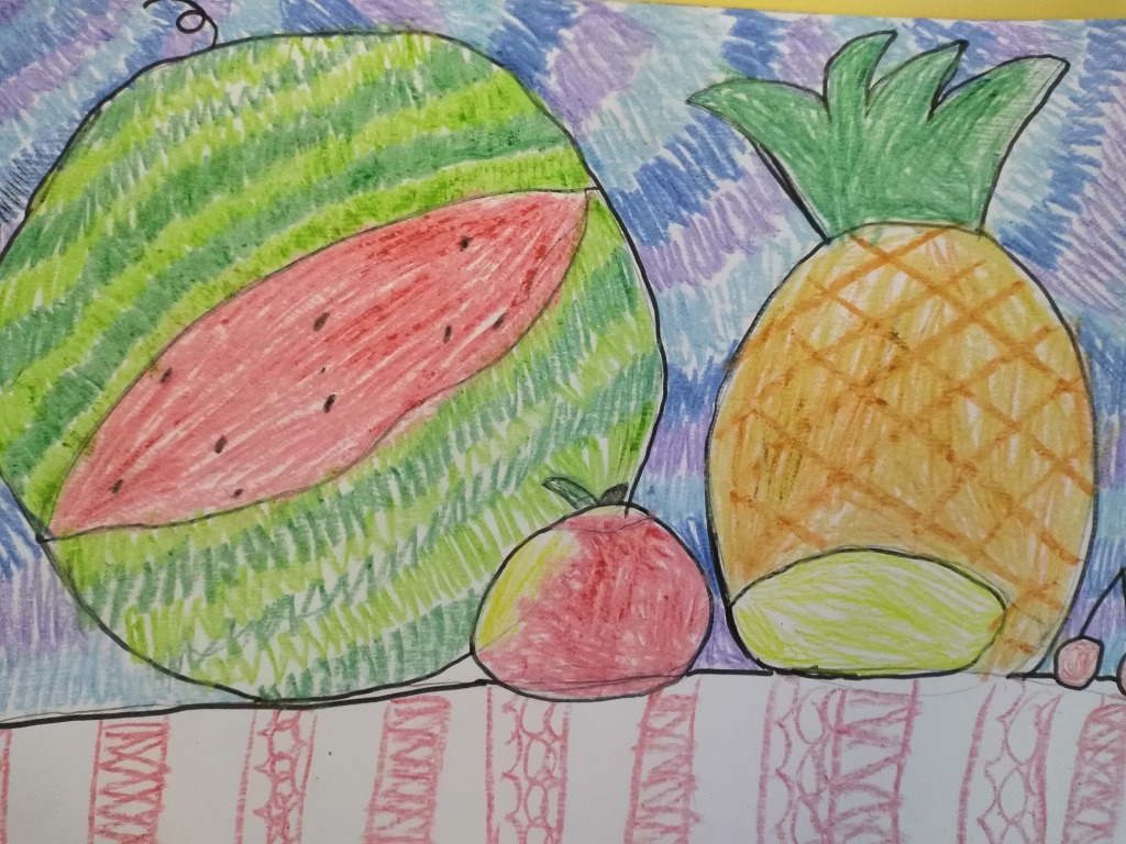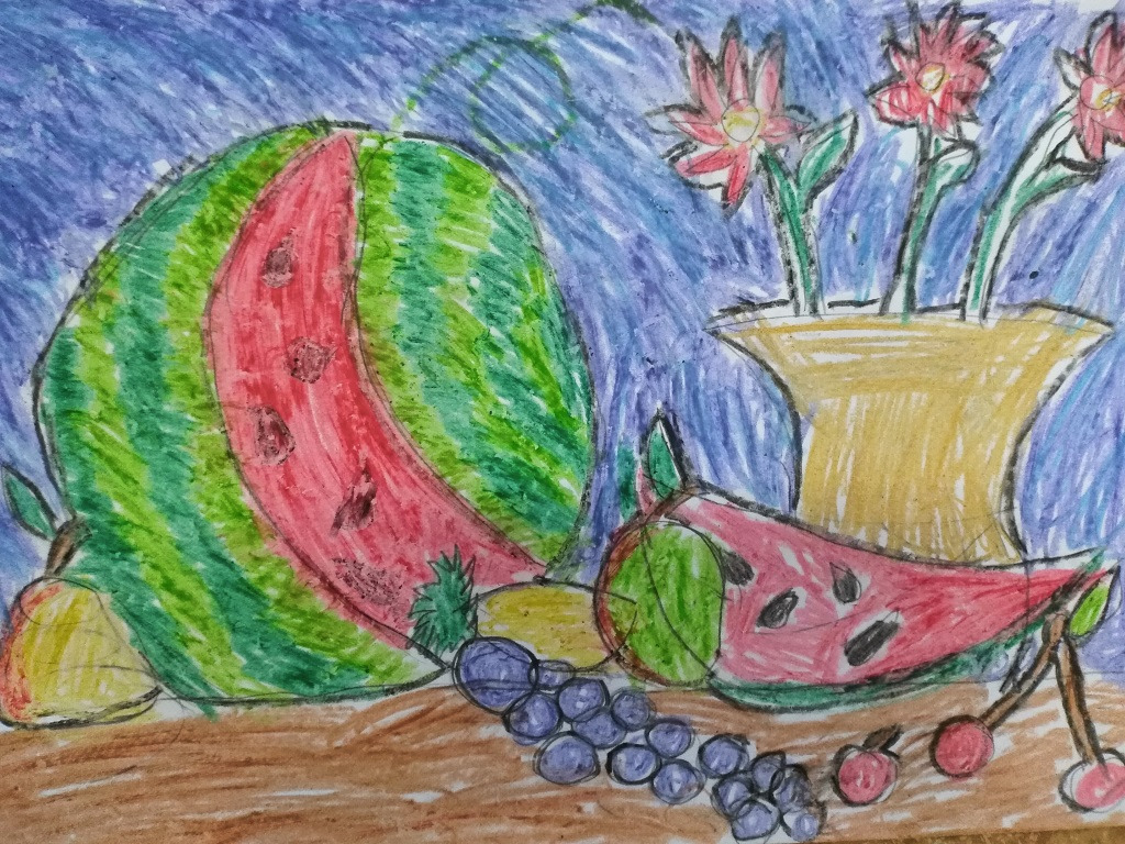 Темой для натюрморта стали дары осени. Дети сами выбирали, что будут рисовать: яблоки и виноград или букет ромашек с грушей. Однако главный герой рисунка - арбуз - должен был присутствовать у всех. При этом рисовать арбуз нужно было без использования круглого шаблона, а также нужно было суметь передать игру цвета на кожуре арбуза. Использование короткого, частого штриха помогло не только при закрашивании арбуза, но и позволило затонировать лист. Цвет фона нужно было подбирать самостоятельно и так, чтобы предметы натюрморта с ним не сливались. Если для изображения фруктов дети использовали теплые тона, то для фона – холодные. Причем, можно сочетать несколько оттенков. Скатерть, на которой находились дары осени, тоже было предложено украсить сложным оригинальным орнаментом. Подчеркнуть форму и задать яркость очертаниям предметов помогали черные фломастеры.