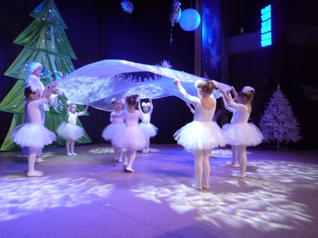 Девочки из «Морозко» представили вниманию зрителей красивый, нежный танец Снежинок и Снегурочки с зимним покрывалом (постановщик танца - музыкальный руководитель И.А. Борисова; в роли Снегурочки выступила воспитатель группы В.Ю. Деткова). В пушистых юбочках-пачках девочки порхали по сцене, словно маленькие балеринки…