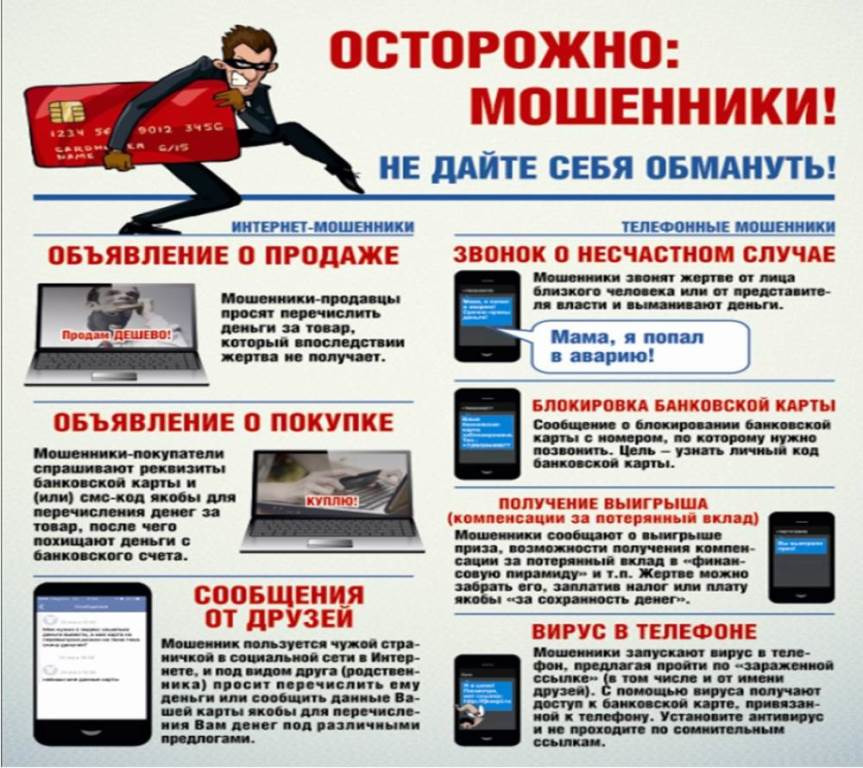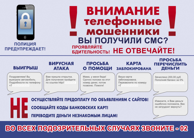 Также участились случаи краж денежных средств с банковских карт. Злоумышленники, используя базы данных сотовых операторов, звонят на мобильные телефоны, представляясь работниками различных организаций. В процессе разговора преступники предлагают открыть более выгодные вклады, сообщают, что банковская карта заблокирована и необходимо перевести денежные средства на другой счет и дают инструкции как это сделать через банкомат или путем сообщения им кодов поступающих через смс-сообщения. В реальности же деньги переводятся на счета злоумышленников, а номера телефонов, с которых они звонили, становятся недоступны.