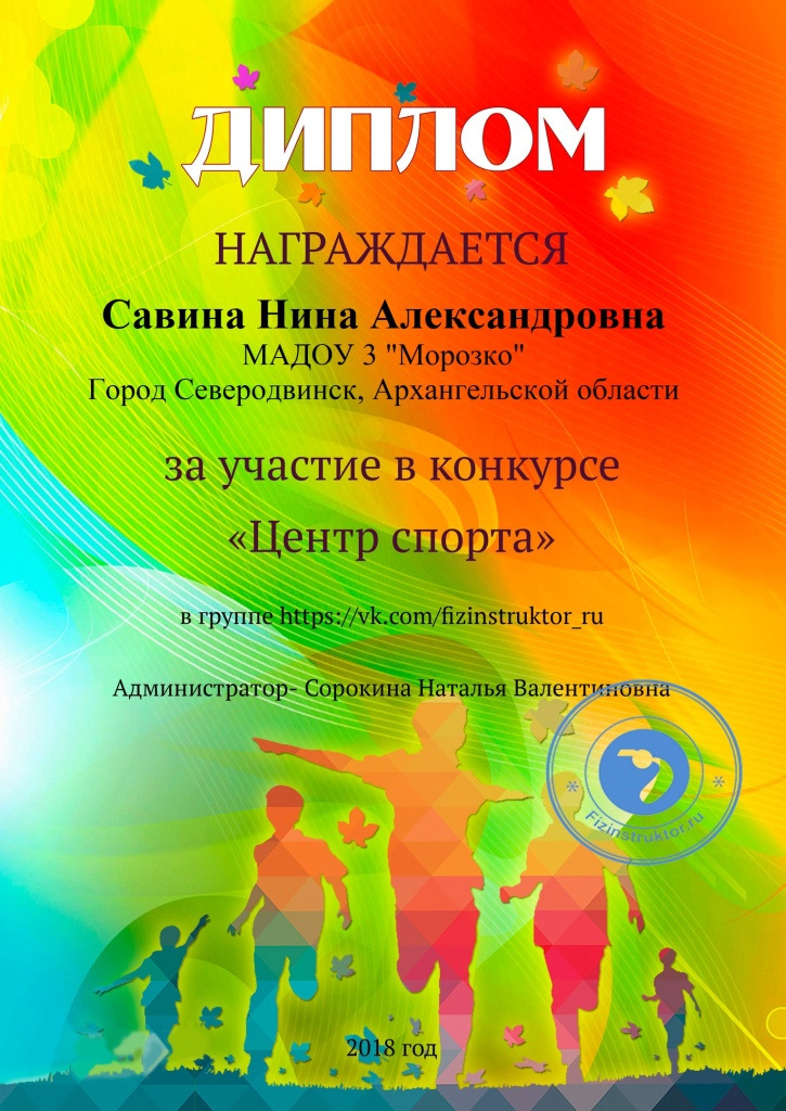 В октябре 2018 года на интернет-сайте в открытой группе «Физинструктор.Ру» прошел фотоконкурс «Центр спорта», в котором приняли участие 76 человек. Инструктор по физической культуре Савина Нина Александровна представила на конкурс фотографии спортзала МАДОУ № 3 «Морозко» и заняла 8 место в номинации «Мой спортзал» из 58 работ.