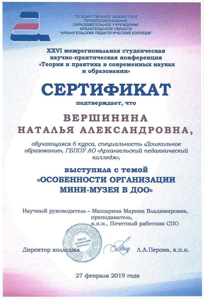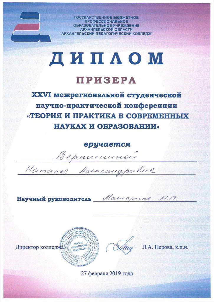 В марте 2019 года воспитатель старшей группы Вершинина Наталья Александровна выступила с темой «Особенности организации мини-музея в ДОО» в рамках XXVI межрегиональной студенческой научно-практической конференции «Теория и практика в современных науках и образовании» в ГБПОУ «Архангельский педагогический колледж». Выступление нашей коллеги вызвало интерес слушателей. Наталья Александровна была удостоена ДИПЛОМА ПРИЗЕРА.