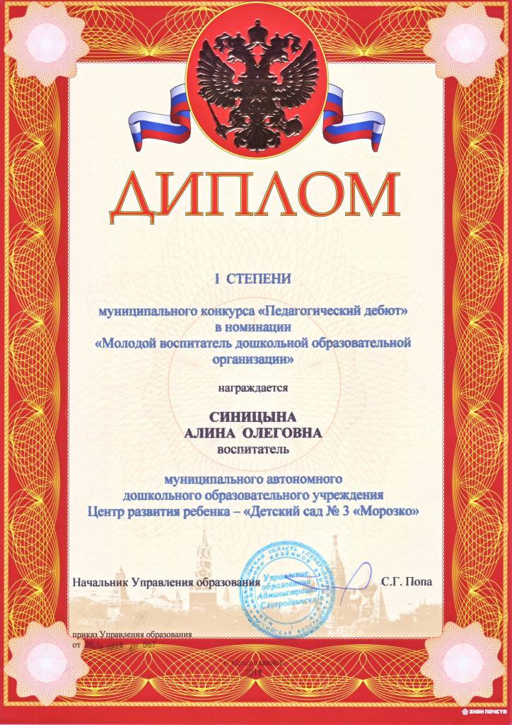 СИНИЦЫНА АЛИНА ОЛЕГОВНА, воспитатель группы «Солнышко», стала ПОБЕДИТЕЛЕМ муниципального конкурса «Педагогический дебют» в номинации «Молодой воспитатель дошкольной образовательной организации».