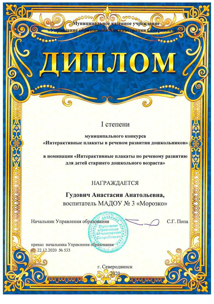 Воспитатель подготовительной к школе группы «Снежинка» Гудович Анастасия Анатольевна заняла 1 место в номинации «Интерактивные плакаты по речевому развитию для детей старшего дошкольного возраста» с конкурсной работой по теме «Звук «С». Анастасией Анатольевной был создан интерактивный плакат для автоматизации звука «С», включающий в себя различные игровые задания: артикуляционную и дыхательную гимнастику, глазодвигательные упражнения и упражнения на произношение изолированного звука «С», звука «С» в слогах, словах, во фразах, скороговорках, игры на развитие фонематического слуха. Жюри отметило оригинальность разработки дидактического пособия, авторские находки воспитателя, проявление креативности при оформлении плаката.