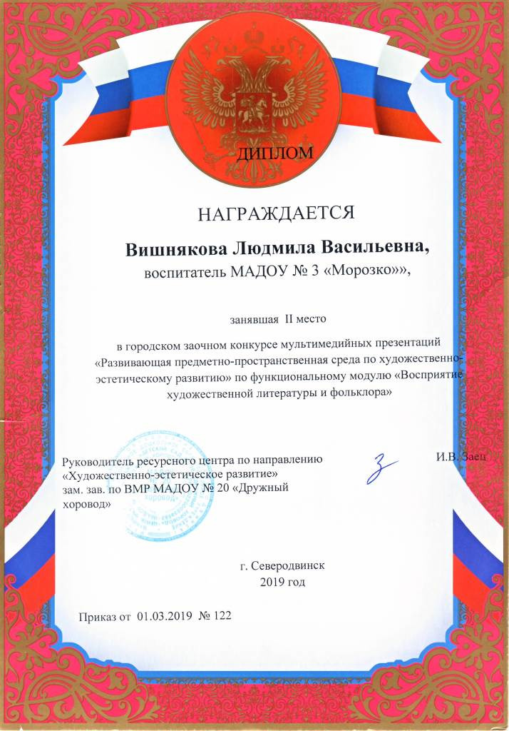 Вишнякова Людмила Васильевна, воспитатель подготовительной к школе группы «Медвежонок» приняла участие в городском заочном конкурсе мультимедийных презентаций «Развивающая предметно-пространственная среда по художественно-эстетическому развитию» и заняла II место в номинации «Лучшая предметно-пространственная среда по функциональному модулю «Восприятие художественной литературы и фольклора».