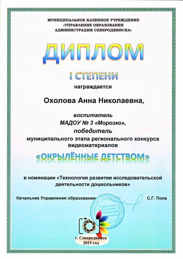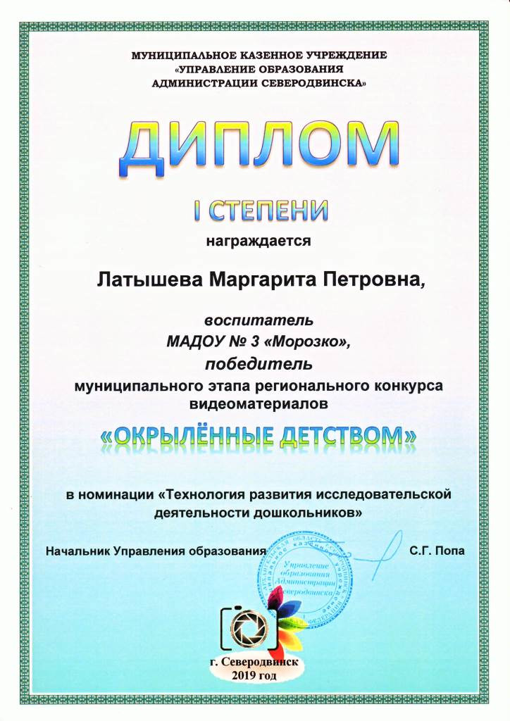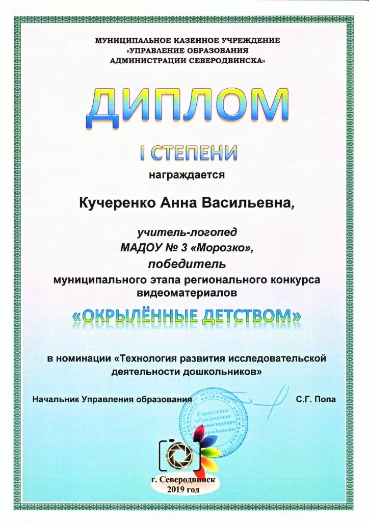 В 2019 году тема конкурса - «Развитие способностей и талантов дошкольников». МАДОУ № 3 «Морозко» на муниципальном этапе конкурса представляло видеоролик «Технология развития исследовательской деятельности дошкольников», созданный учителем-логопедом Кучеренко А.В., воспитателями группы № 3 «Солнышко» Синицыной А.О. и Охоловой А.Н., воспитателем по изодеятельности Латышевой М.П., с участием воспитанников группы «Солнышко».