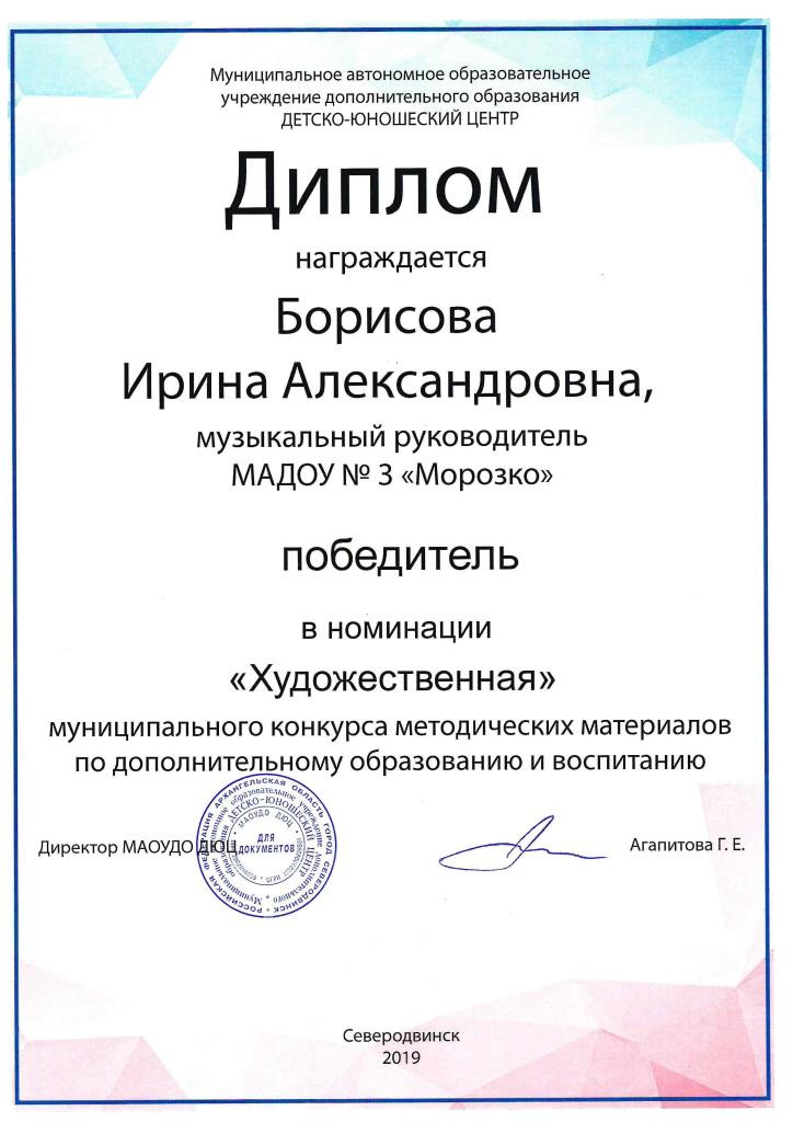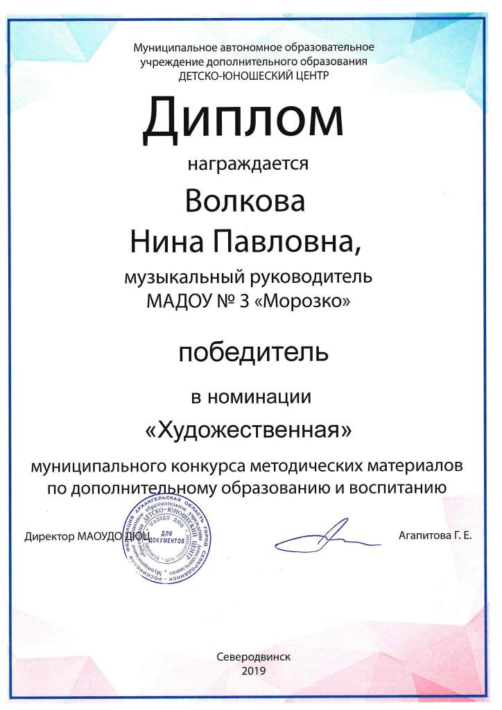 В ноябре 2019 года на базе МАОУ ДО ДЮЦ 36 педагогов из 14 муниципальных образовательных организаций города Северодвинска приняли участие в конкурсе методических материалов по дополнительному образованию и воспитанию. От детского сада «Морозко» участвовали музыкальные руководители Борисова Ирина Александровна и Волкова Нина Павловна, которые представили на конкурс конспект обобщающего занятия в форме КВН «Волшебный мир театра» в рамках театральной студии «Сказка. Наши педагоги творчески подошли к составлению конспекта, использовали различные приемы и методы для развития театральных навыков, музыкальности и любознательности воспитанников и стали победителями в номинации «Художественная».