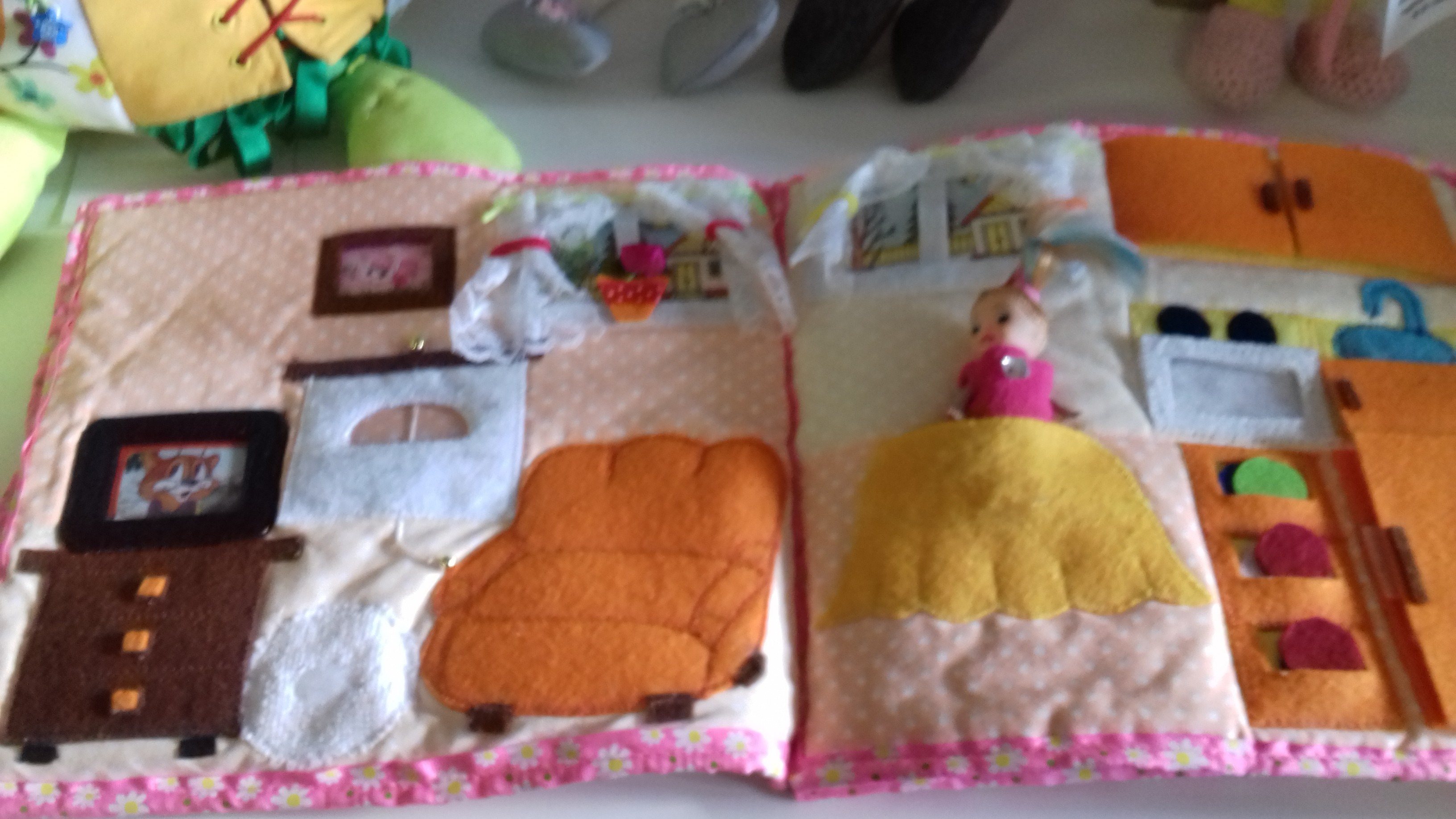 Победителем конкурса в номинации «Мир детства» (техника «шитье») стала Юлия Александровна Беданова за изготовленный лэпбук «Домик для Вики», а также детский костюм «Конфетка».