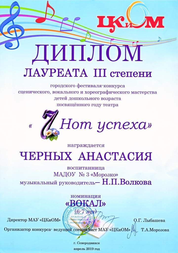 Наше дошкольное учреждение на конкурсе представляла воспитанница подготовительной к школе группы «Снежинка» Черных Анастасия. Она участвовала в номинации «Вокал». На конкурсе Настя исполнила песню «Чудо сказки», которую подготовила вместе с музыкальным руководителем Волковой Ниной Павловной. На заключительном гала-концерте все участники конкурса получили дипломы и подарки от спонсоров. Выступление Насти было отмечено дипломом лауреата III степени.