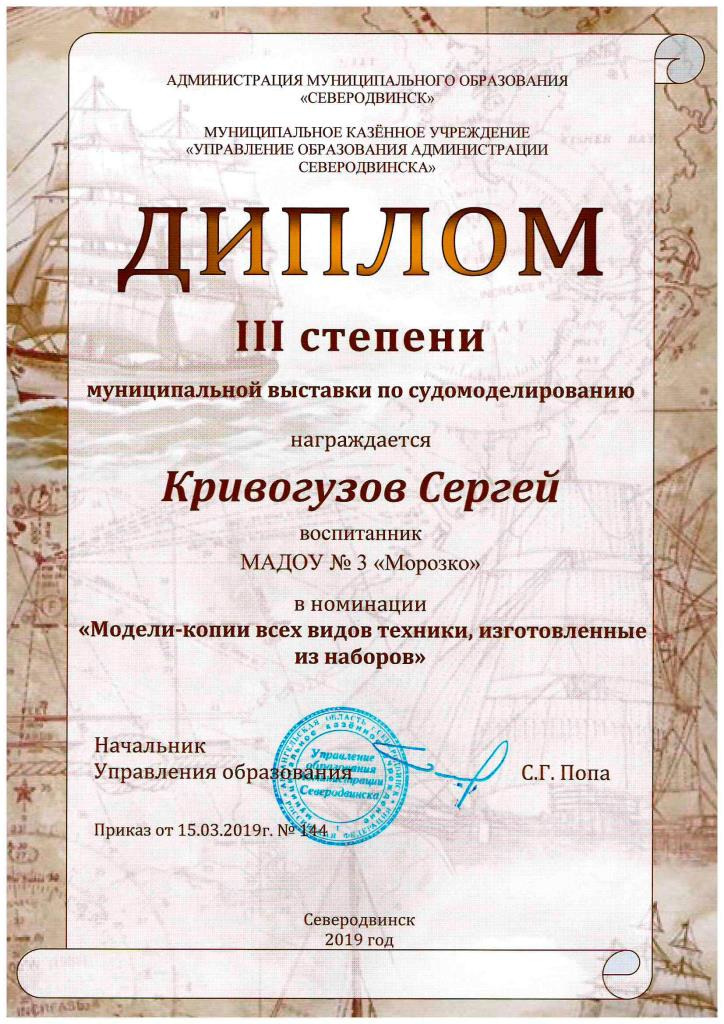 Работа Кривогузова Сергея «Морской патруль» (воспитатель – Деткова Виктория Юрьевна) была удостоена диплома III степени в номинации «Модели-копии всех видов техники, изготовленные из наборов».