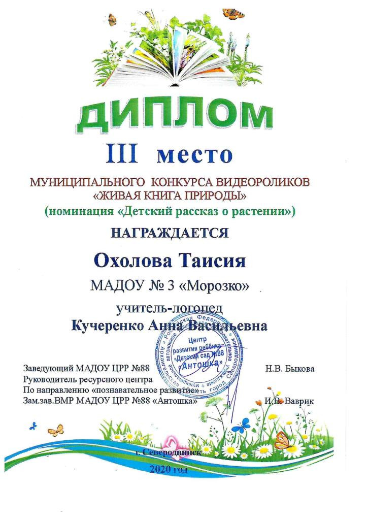 Видеоролик Охоловой Таисии, воспитанницы подготовительной к школе группы «Рябинка», (педагог – Кучеренко Анна Васильевна) удостоен Диплома 3 степени в номинации «Детский рассказ о растении».