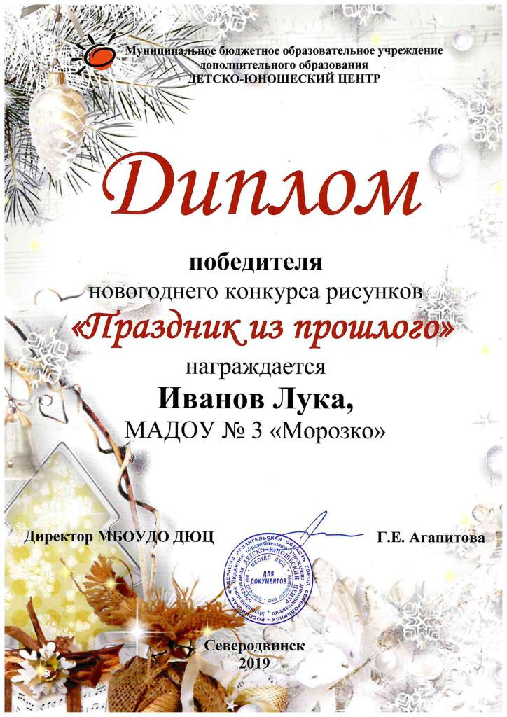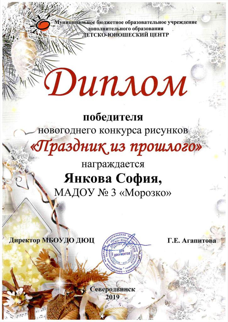 Дети нашего дошкольного учреждения активно принимают участие в различных конкурсах детского творчества на базе МБОУДО ДЮЦ г. Северодвинска. В декабре 2018 года проходил необычный конкурс детских рисунков «Праздник из прошлого», где оценивались творческие работы, изображающие новогодний праздник из детства пап и мам, бабушек и дедушек участников конкурса. Дополнительно к рисунку было необходимо приложить краткую историю-воспоминание из детства бабушки, дедушки, мамы или папы о встрече Нового года. На конкурс было представлено 84 рисунка из 19 образовательных организаций города, в том числе и 9 работ воспитанников «Морозко». Жюри отметило мастерство всех участников и качество творческих работ.